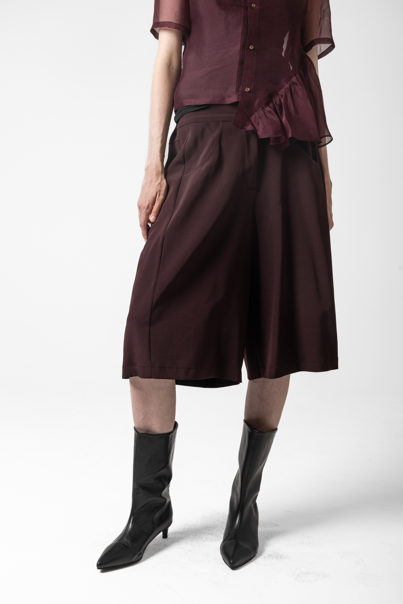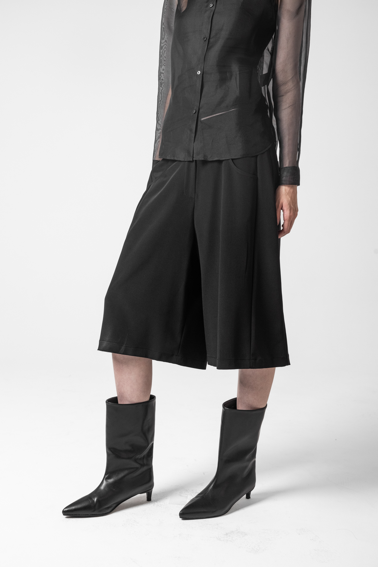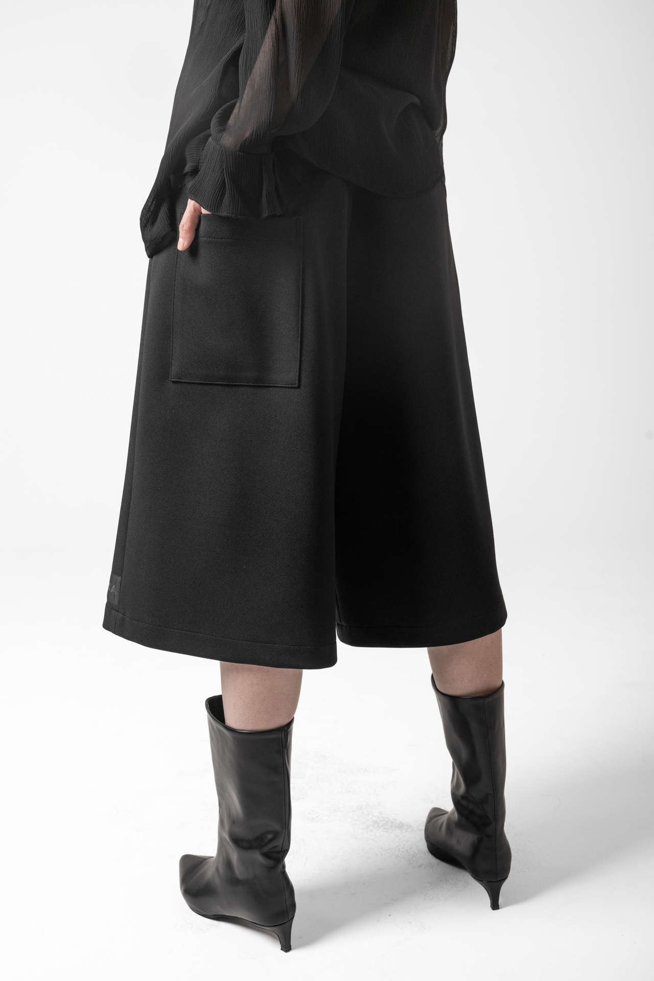 고급스러운 블랙 컬러와 매트한 텍스처가 세련된 무드를 연출하며, 무릎 길이의 여유로운 실루엣이 편안한 착용감을 제공합니다. 후면 포켓 디테일이 실용성과 디자인 포인트를 동시에 살려줍니다.