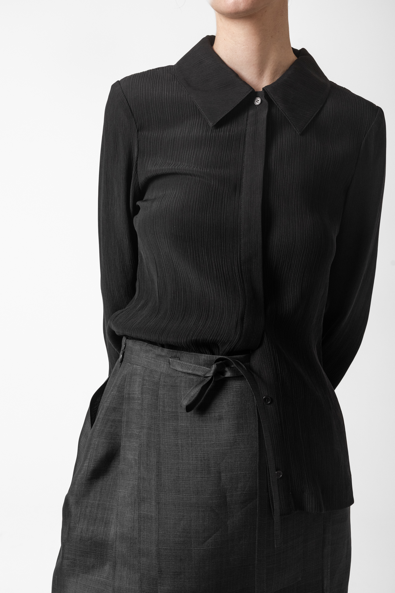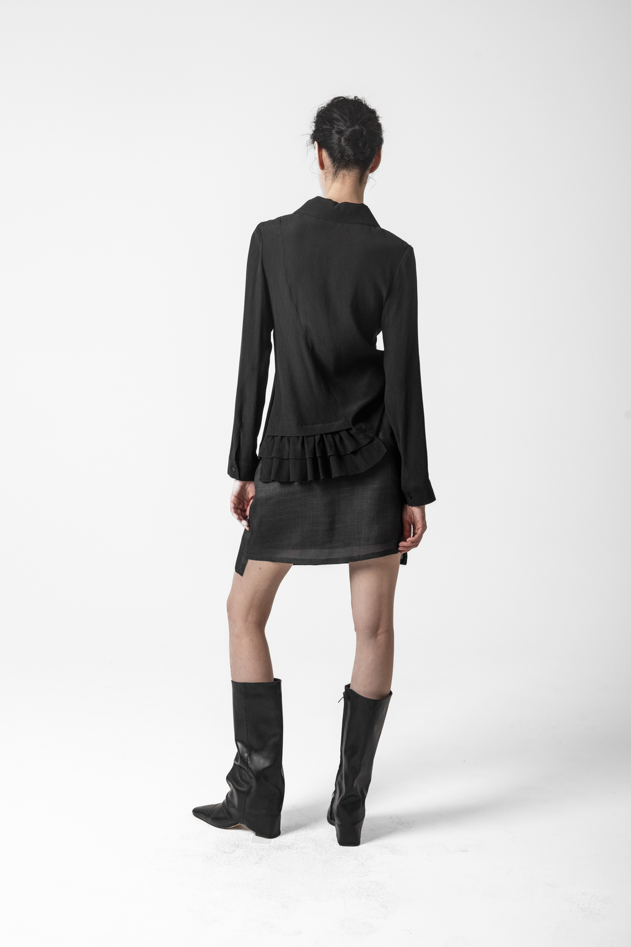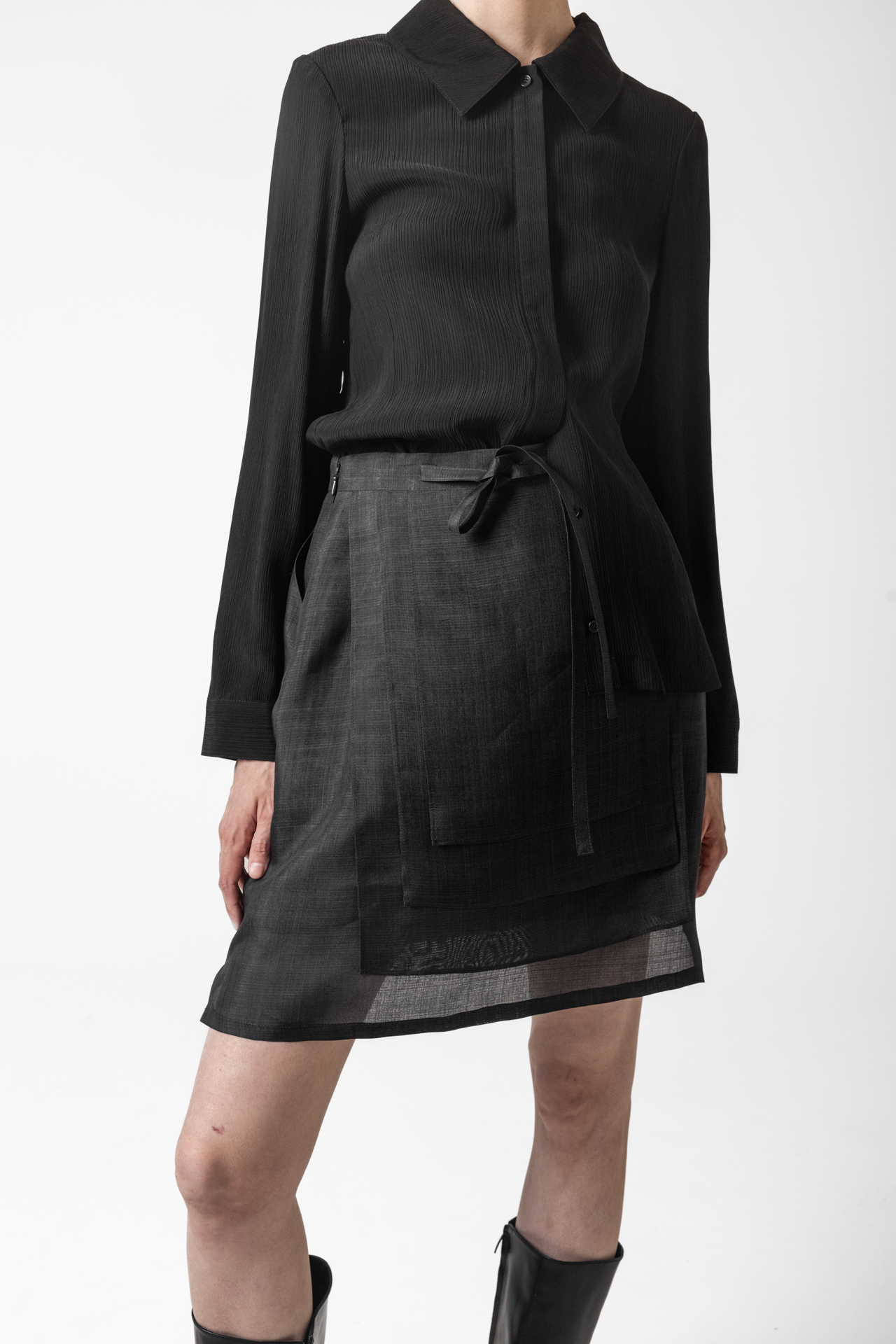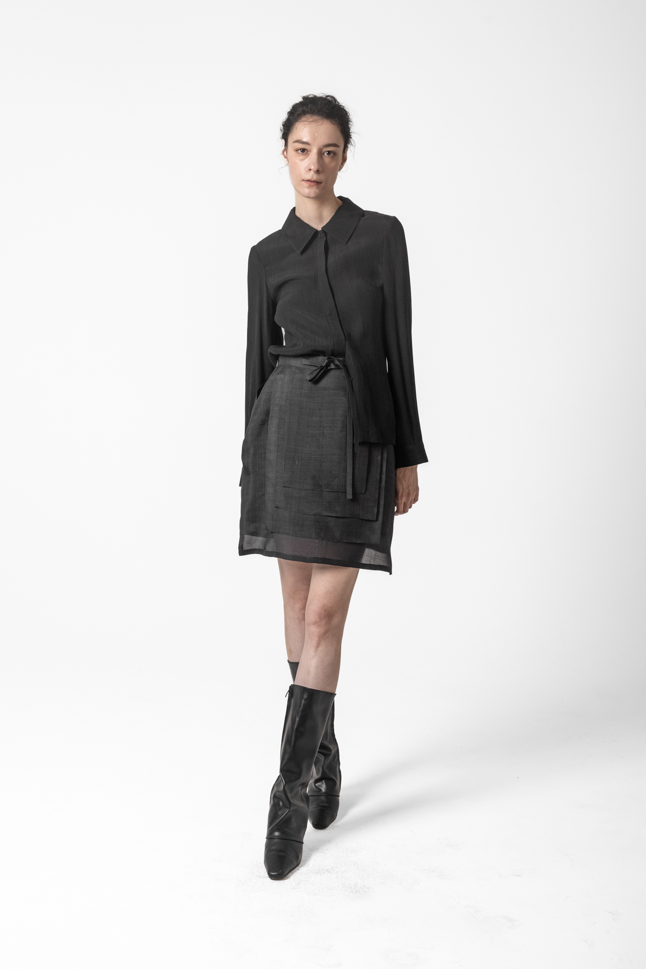 은은한 시어한 실크 소재로 완성된 레이어드 디자인이며, 랩 스타일과 앞치마 디테일로 유니크한 실루엣을 연출합니다.