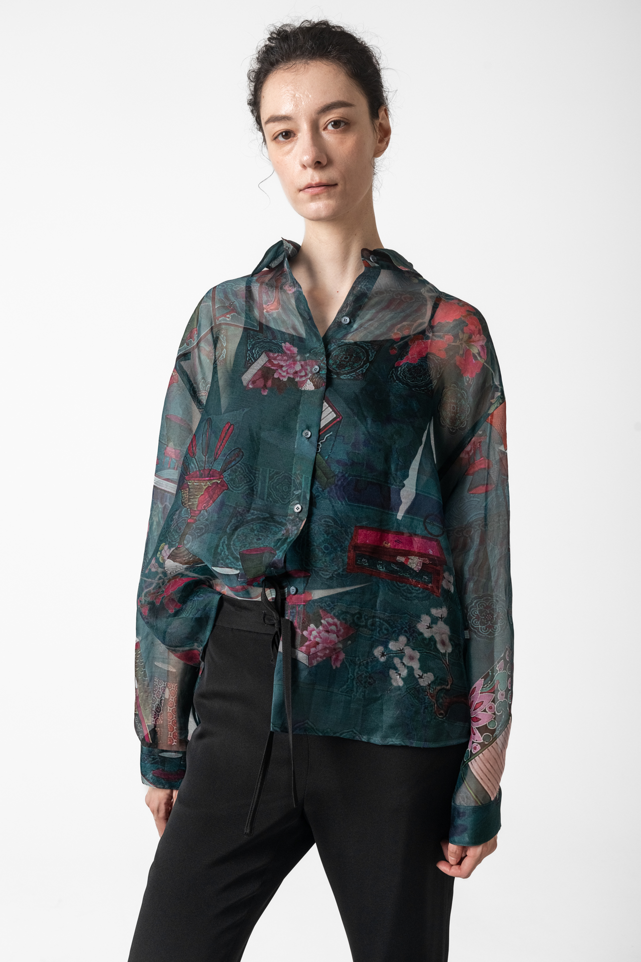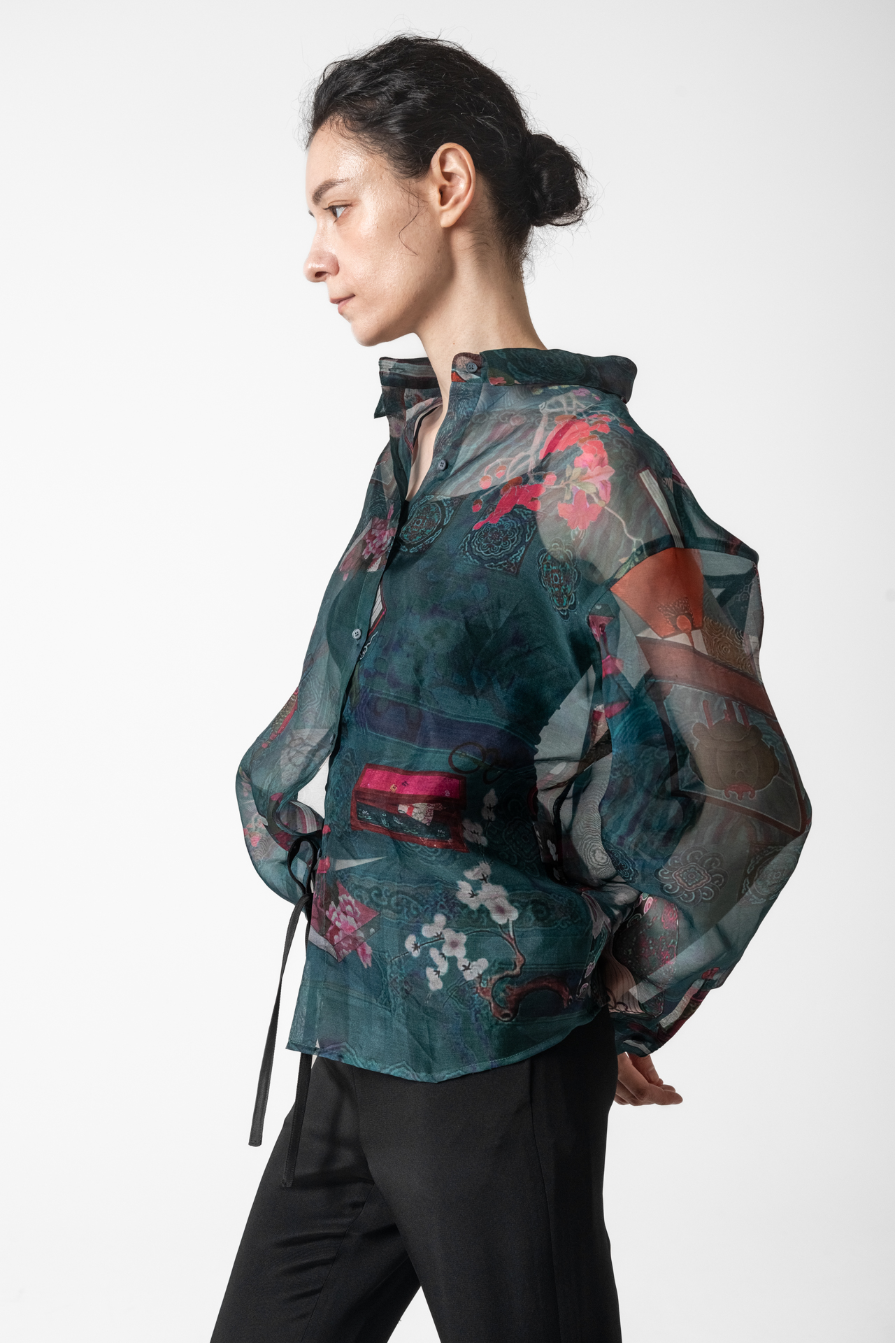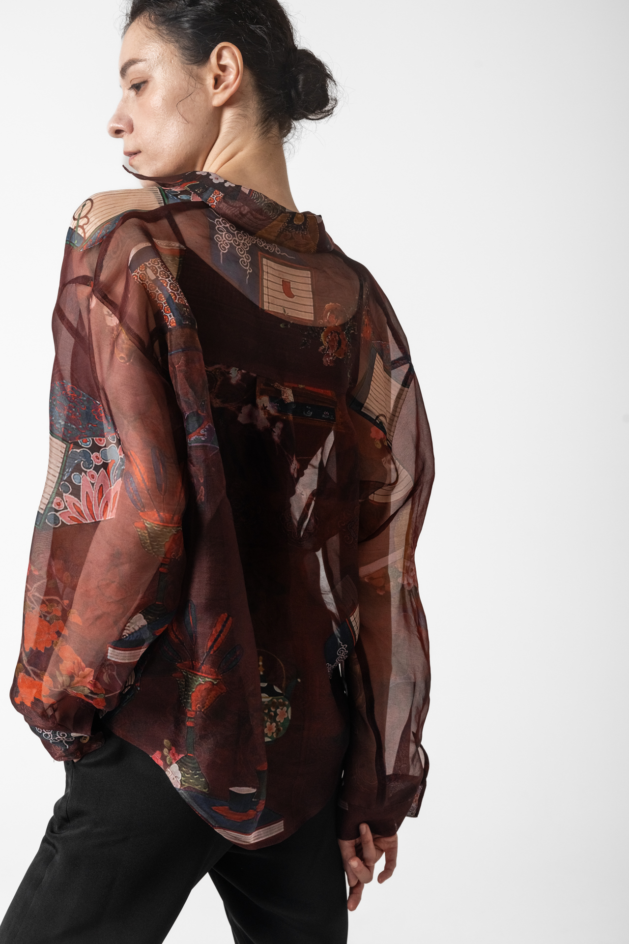 투명한 오간자 소재와 고급스러운 동양풍 프린트가 어우러져 우아한 분위기를 연출하는 블라우스입니다. 가벼운 착용감과 세련된 디자인으로 특별한 날에 잘 어울립니다.