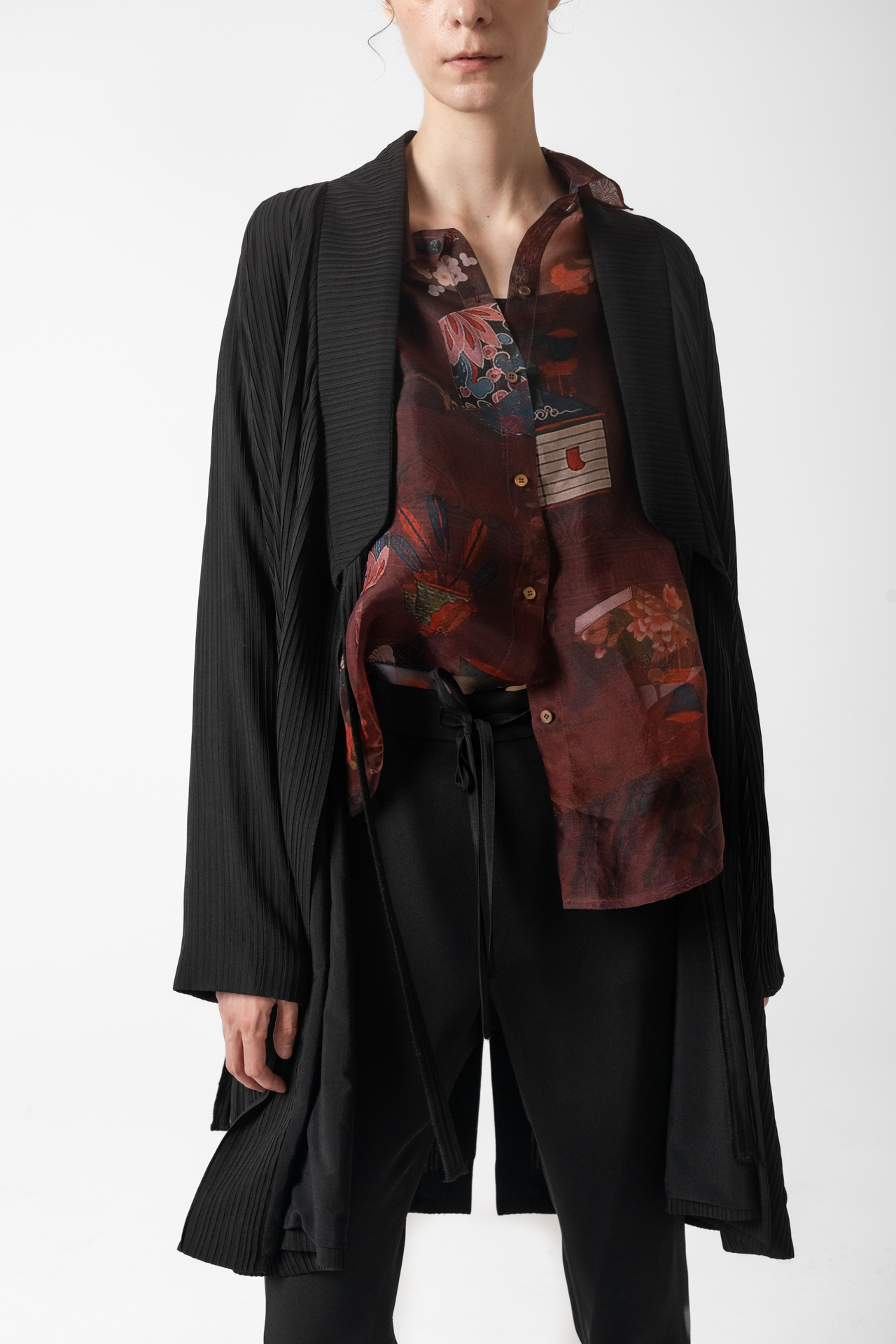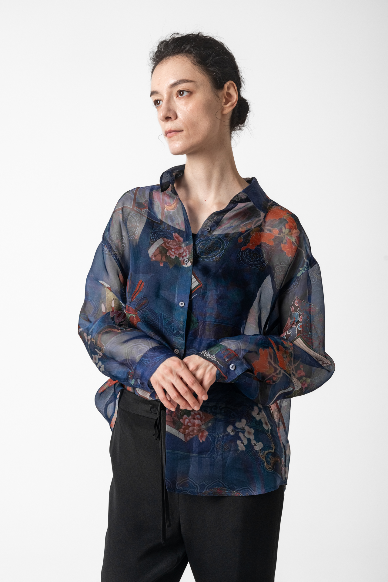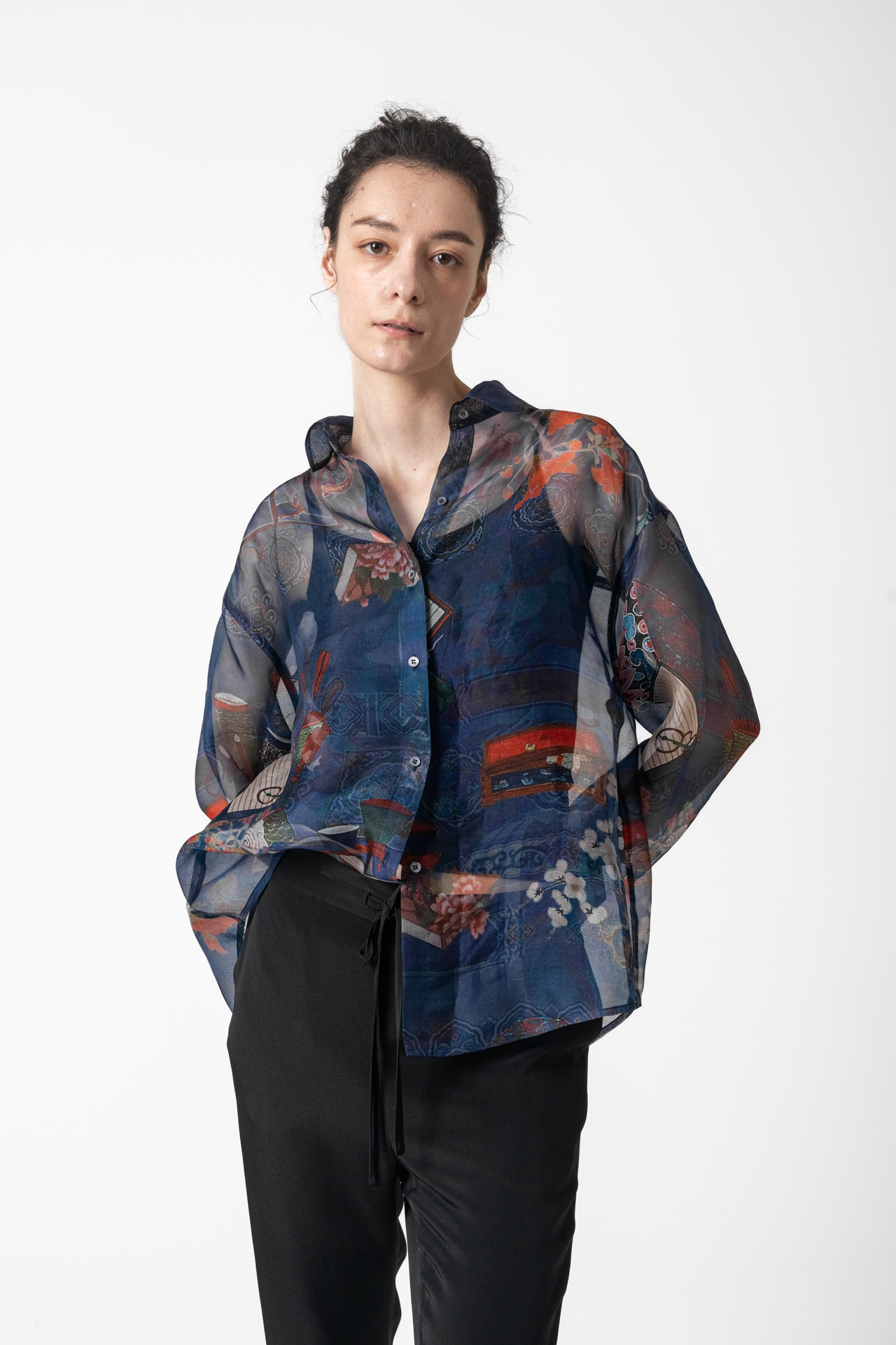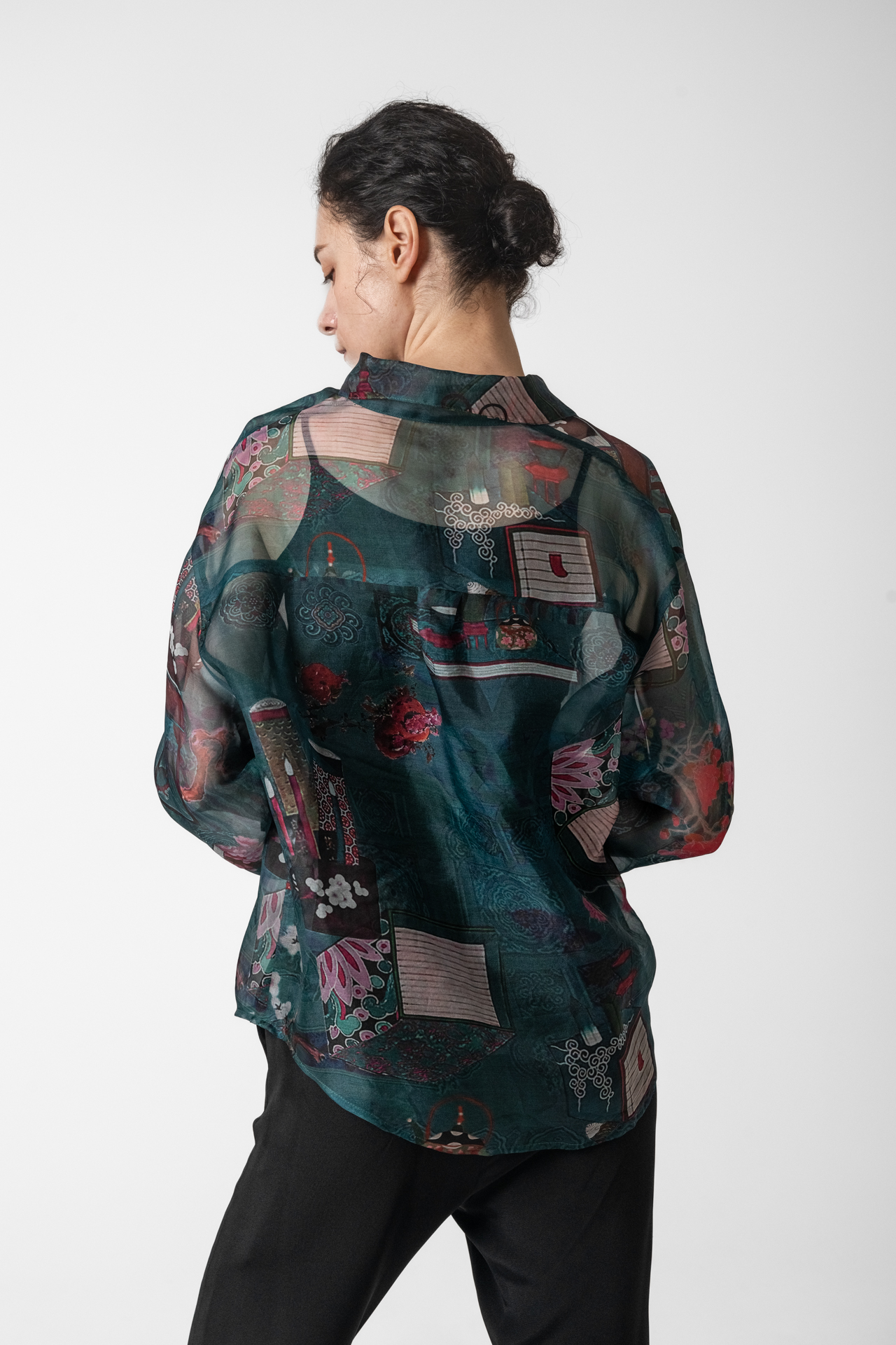 투명한 오간자 소재와 고급스러운 동양풍 프린트가 어우러져 우아한 분위기를 연출하는 블라우스입니다. 가벼운 착용감과 세련된 디자인으로 특별한 날에 잘 어울립니다.