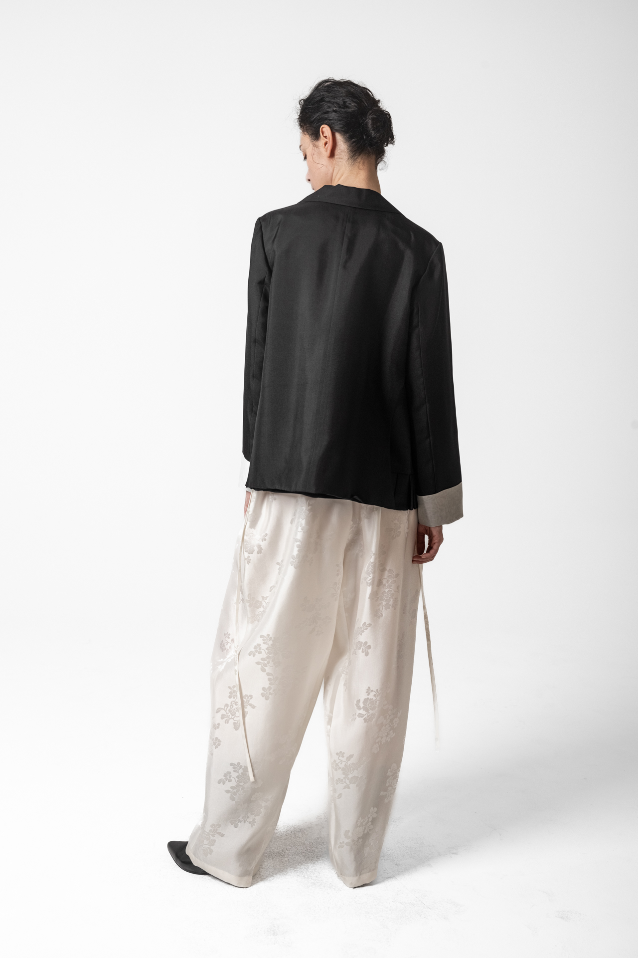 은은한 광택과 입체적인 플라워 자카드 패턴이 고급스러운 실크 팬츠로, 여유로운 핏과 부드러운 터치감이 편안함과 세련미를 동시에 완성합니다.