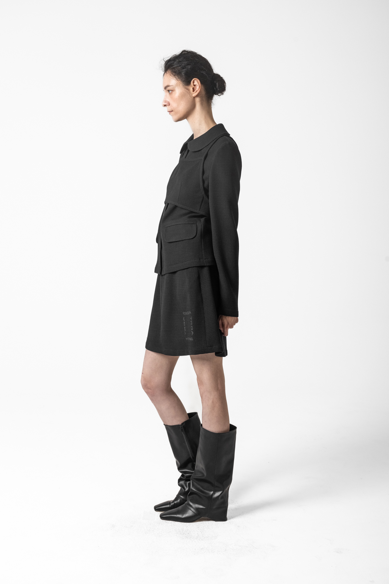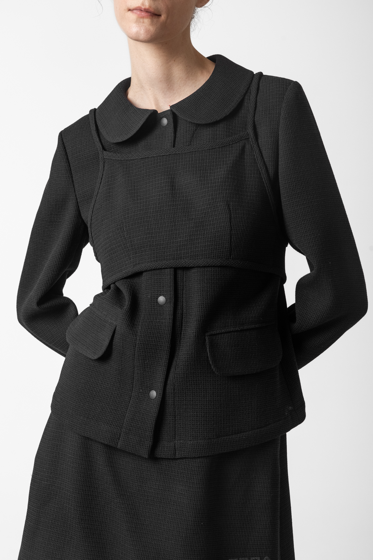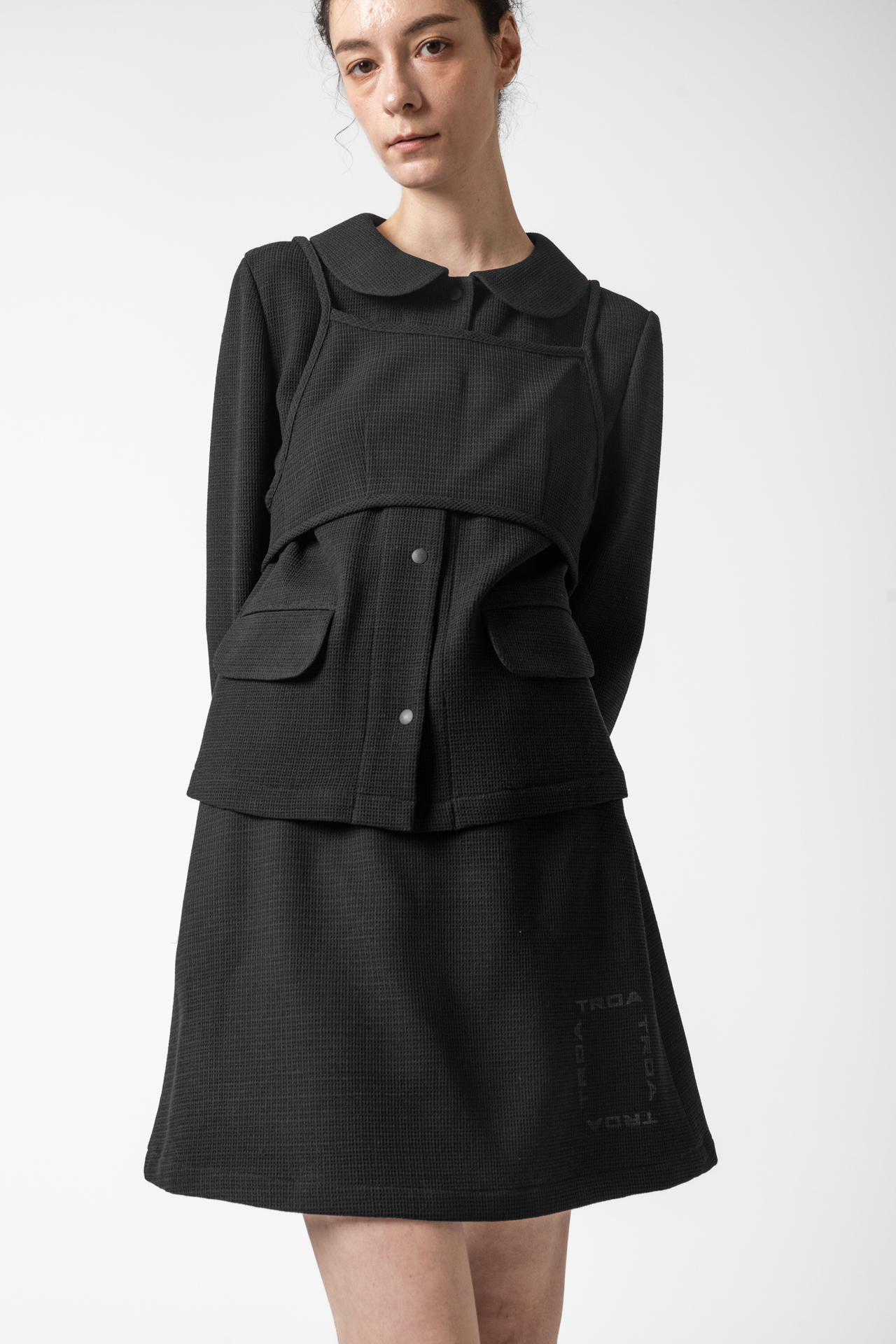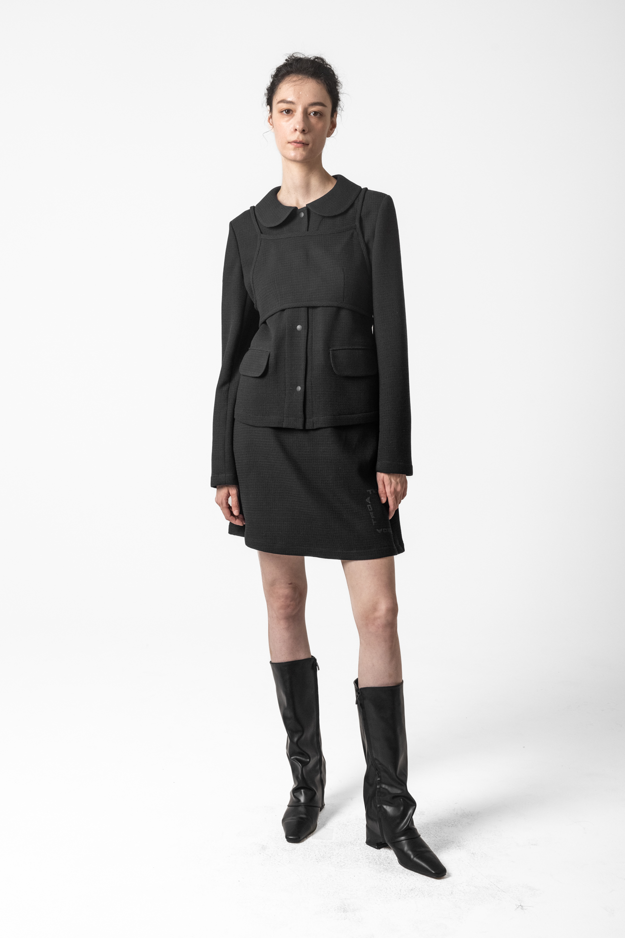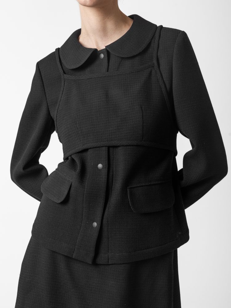 고급스러운 텍스처 원단으로 미니멀하면서도 세련된 분위기를 연출합니다. 앞판 비브 디테일이 구조적인 포인트를 더해 차별화된 스타일을 완성합니다. 깔끔한 실루엣과 적당한 기장감으로 다양한 하의와 매치하기 좋습니다.
