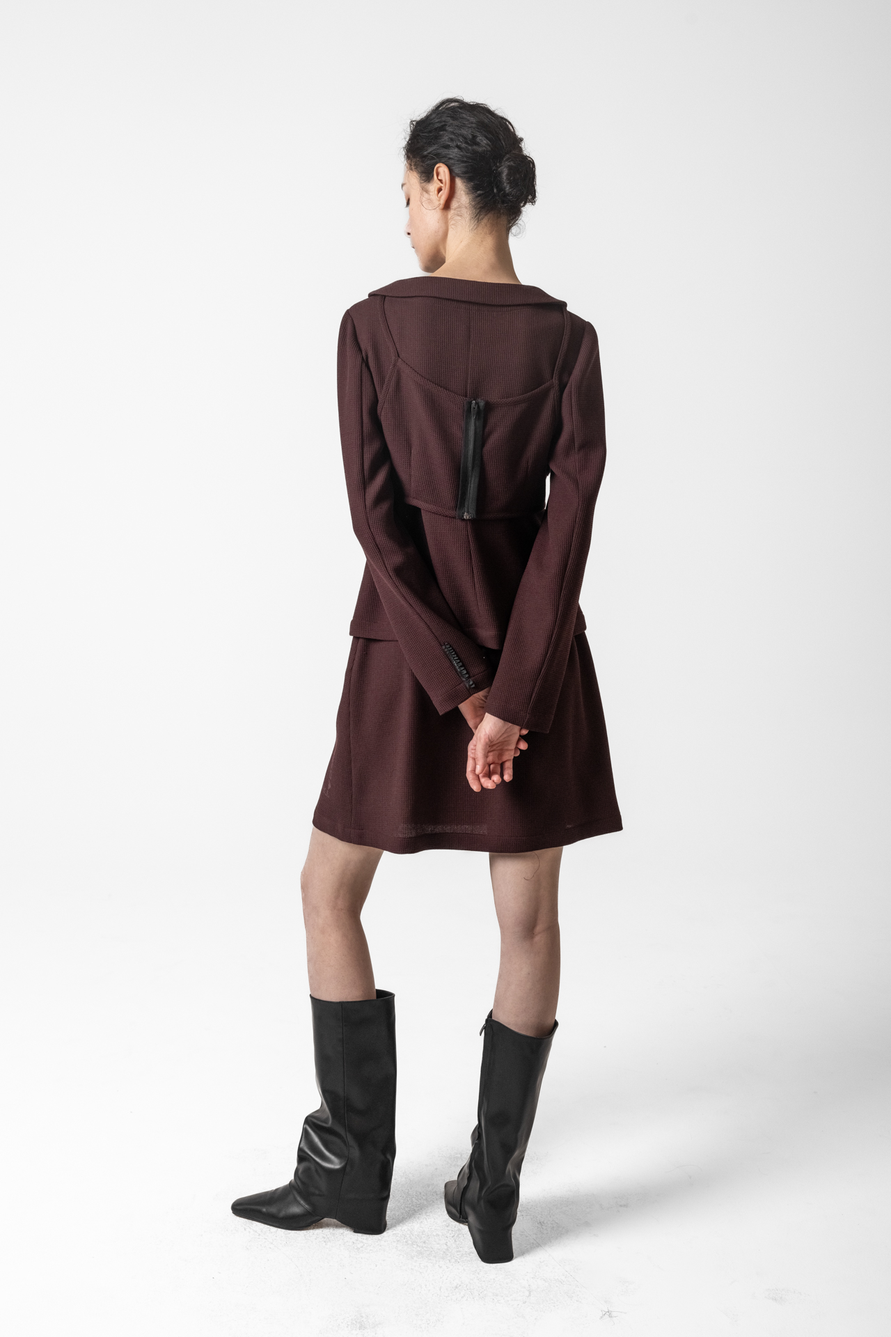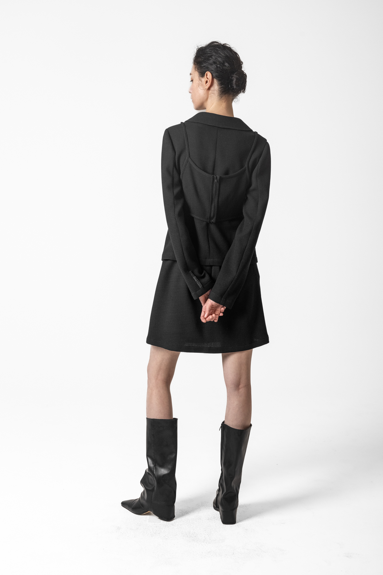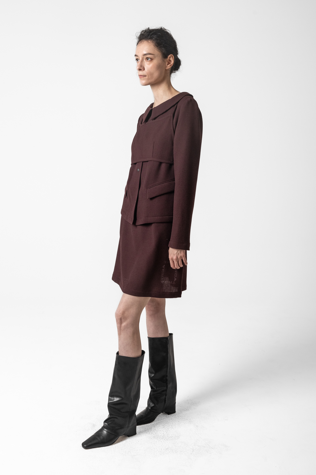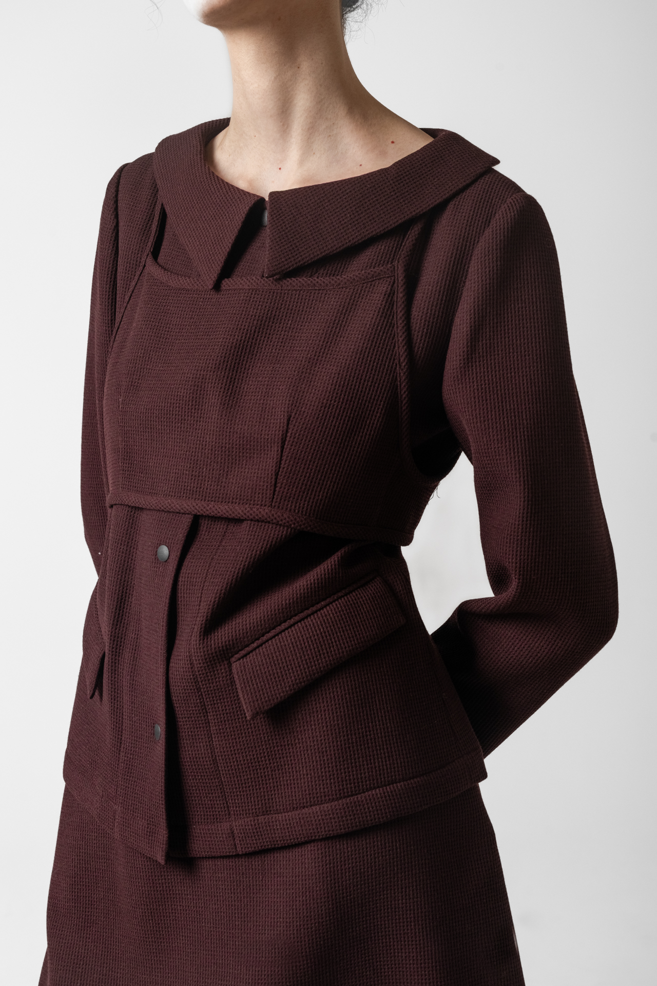고급스러운 텍스처 원단으로 미니멀하면서도 세련된 분위기를 연출합니다. 앞판 비브 디테일이 구조적인 포인트를 더해 차별화된 스타일을 완성합니다. 깔끔한 실루엣과 적당한 기장감으로 다양한 하의와 매치하기 좋습니다.
