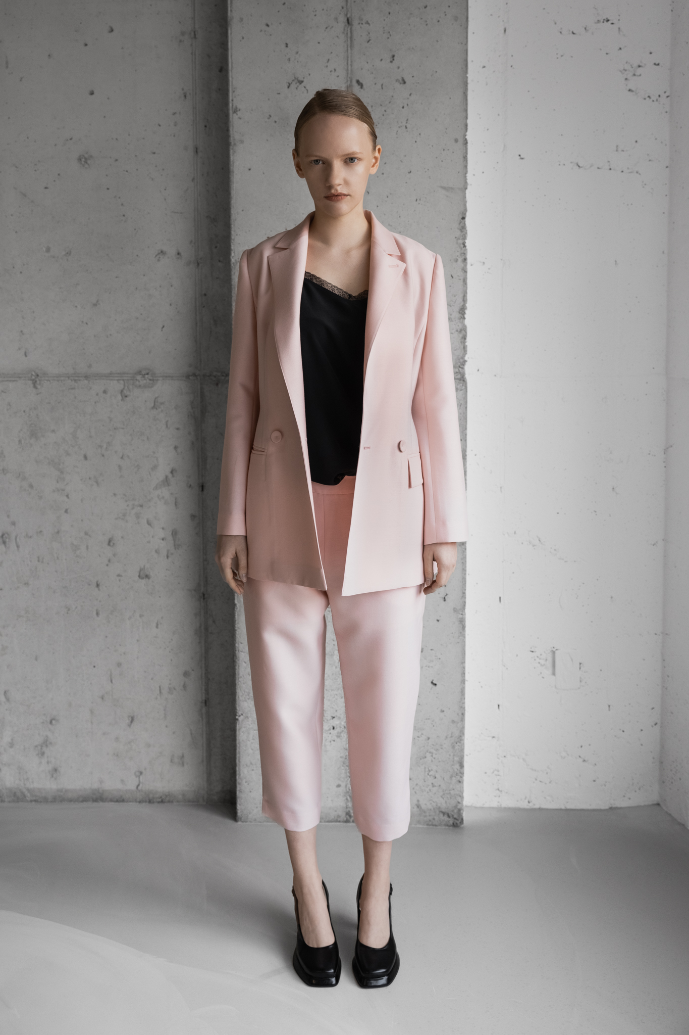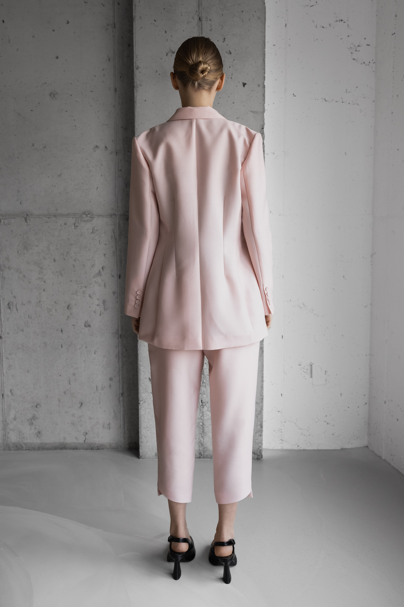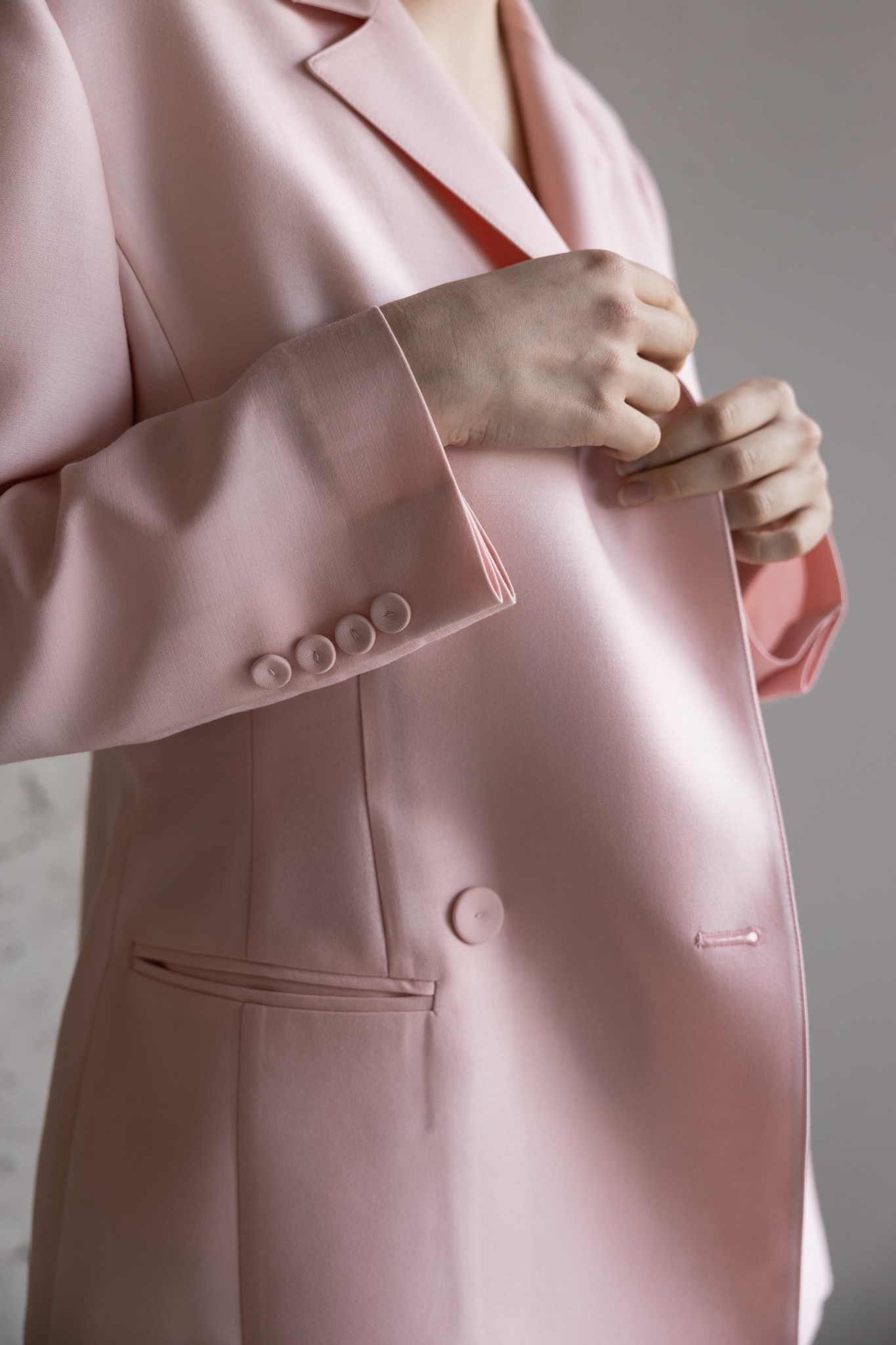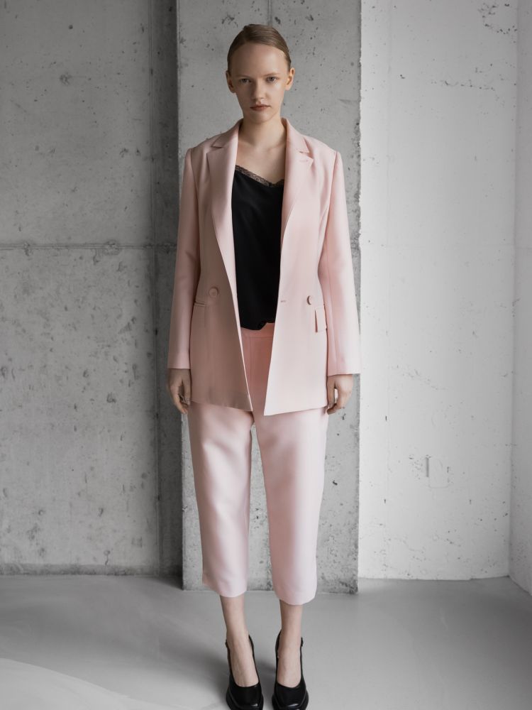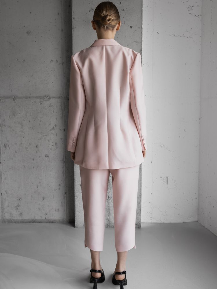 Outer - 울 실크로 광택감이 돌며 라이트 핑크로 덜 과감한 느낌으로 어깨를 강조된 디자인의 긴소매 블레이저.