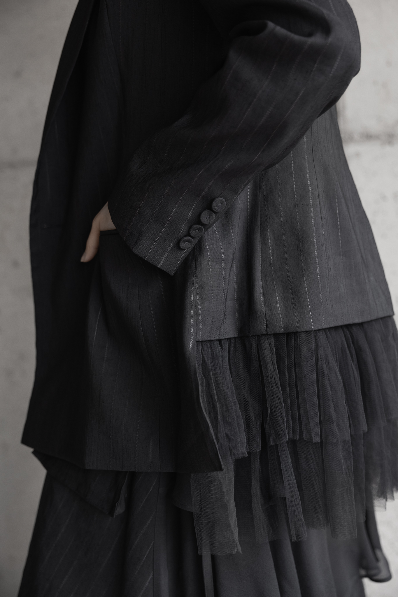 Bottoms - 스커트 앞면은 스트라이트 포켓 실루엣에 쉬폰 실크 스프라이프 소재이고, 뒷면은 티어드 디자인으로 다양한 연출이 가능합니다.